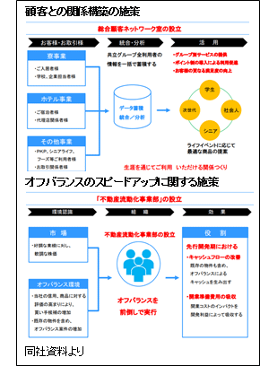②オフバランスを前倒しで実行する。当初、開発コスト増加により、中計の前半2年間を「開発先行期」として、緩やかな成長を目指していた。しかし、市場からはより高い成長を望まれる声も聞かれた。そういったことを踏まえ、新組織「不動産流動化事業部」を組成した。当初の計画上、オフバランスは中計の後半で見込んでいたが、これを前倒しで取り組む。開発先行期間中にもオフバランスによる売却利益を計上することで、開業コストのインパクトを吸収でき、安定的な利益成長も図れる。有利子負債増加を抑制し、財務バランスの改善にも繋がる。尚、開発計画そのものの変更はない。