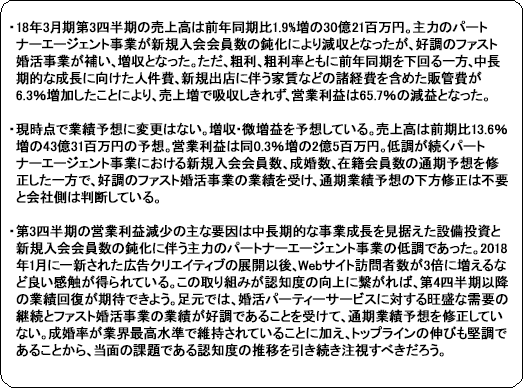 現時点で業績予想に変更はない。増収・増益を予想している。売上高は前期比13.6%増の43億31百万円の予想。営業利益は同0.3%増の2億5百万円。 低調が続くパートナーエージェント事業における新規入会会員数、成婚数、在籍会員数の通期予想を下方修正したが、好調のファスト婚活事業の業績を受け、通期業績予想の下方修正は不要と会社側は判断した。 (2)今後の取り組み