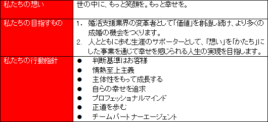 2004年6月、ウェディングの企画および施設の運営を手掛ける株式会社テイクアンドギヴ・ニーズ(4331、東証1部、T&G社)が新規事業として婚活支援事業を始めるにあたり、100%子会社として同社を設立した。そのスタートアップにあたり招聘されたのが大手婚活会社で豊富な経験・実績を積み重ねた現社長の佐藤茂氏。その後T&G社の業況が低調となり、継続的な投資が難しくなったのを機に、2008年5月、佐藤社長を始めとした経営陣と従業員の共同出資により株式を取得し、T&Gグループから独立した。 「顧客成果追求」の結果である成婚率の高さを顧客に評価され、業績は順調に拡大。2015年10月に東証マザーズに上場した。 【1-2 企業理念】