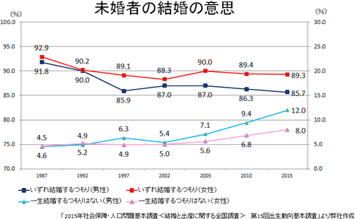 「2016年社会保障・人口問題基本調査<結婚と出産に関する全国調査> 第15回出生動向基本調査」によれば、結婚する意思を持つ未婚者の割合は18~34歳の男性で85.7%、女性で89.3%となっており、「結婚したい」と考えている未婚者の数は依然高水準である。