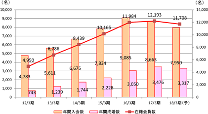 成婚退会した会員がメンバーとなる「アニバーサリークラブ」を主として、様々な提携によるアイテム数の拡充と提供エリアの拡大により、利用者数の増加を目指す。企業主導型保育施設「めばえ保育ルーム」については、すでに開園された三鷹台、亀戸、芦花公園、千歳船橋に続いて、2018年3月用賀、同年4月春日、同年10月上野毛、同年12月都立大学、2019年1月下北沢の計5園の開園を予定している。 |