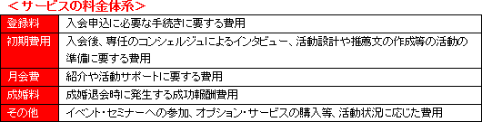 交際中の相手との結婚を視野に入れて交際を継続する意向を双方から受けた上で退会すること。 ③コンタクト(お見合い)の設定:専任のコンシェルジュ以外の活動サポート