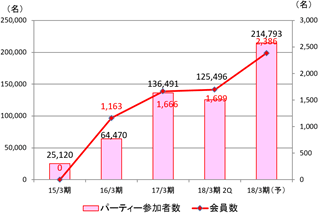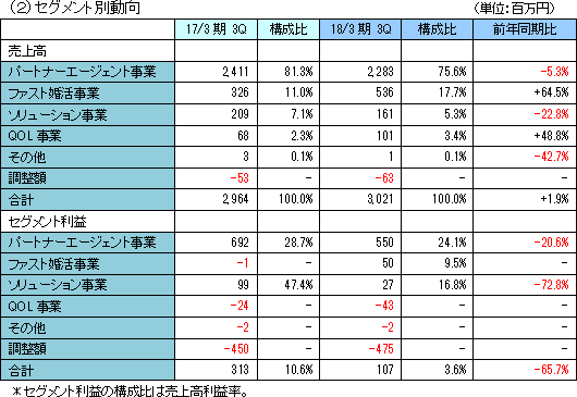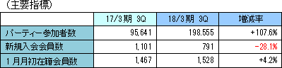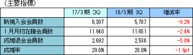 新規入会会員数は前年同期比8.2%の減少。在籍会員数は微減。成婚退会会員数は前年同期では減少しているが、同社が最も重視する顧客成果を表す成婚率は業界内最高水準を維持している。新規入会会員数の減少の主な要因は、第4四半期に向けて広告宣伝費を抑制したこと、広告反応率について大きな改善よりも調整にとどまったことが挙げられる。 また、2017年10月に中国エリアでは初めてとなる広島店を出店し、OTOCONパーティー会場を併設した。 ![]() (ファスト婚活事業)