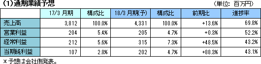 ![]() 長短借入金の増加等で負債合計は同3億55百万円増加の19億57百万円。 親会社株主に帰属する四半期純利益の計上及び自己株式の減少で純資産は同1億43百万円増加の8億4百万円となった。この結果、自己資本比率は前期末と変わらず29.1%となった。 (4)トピックス