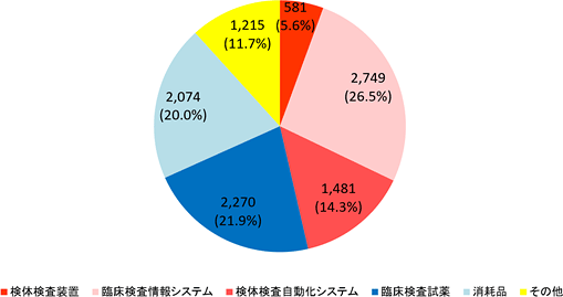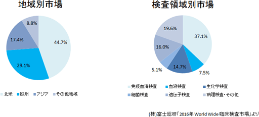 株式会社富士総研によれば、日本における臨床検査市場は2016年5,013億円で世界市場の6.0%を占めるが、これまで拡大をけん引してきた免疫血清検査の伸びが鈍化しており、市場は微増となっている。2022年の市場は5,195億円と年平均成長率は0.6%にとどまる。(国内市場・世界市場) 日本臨床検査薬協会のホームページの情報を基にエイアンドティー社が推定した国内の装置・試薬市場は約5,900億円。うち生化学検査が1,958億円、血液検査は306億円となっている。 一方で、同じく富士総研の調査によれば世界市場は2015年に約623億米ドル(1ドル=100円で6兆2,300億円)となった。今後も世界市場は年平均2.4%で成長し、2020年には約704億米ドル(1ドル=100円で7兆400億円)と予測されており、検査環境が整備途上にある東欧、ロシア、アジア、南米、アフリカが成長の牽引役となると見ている。 日本メーカーは国内市場の飽和感が強まる中、国内の安定した事業基盤をベースに、その高い技術や品質を武器に世界市場での展開を指向する方向にあると述べている。 ![]() (検査領域別動向)