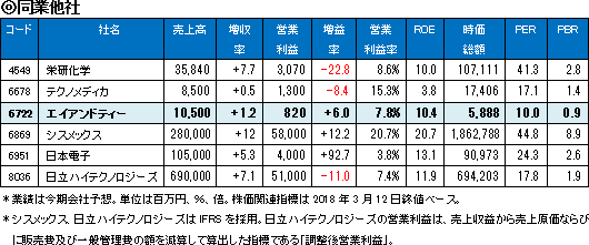 シスメックス(6869、東証1部)、日立ハイテクノロジーズ(8036、東証1部)、日本電子(6951、東証1部)、和光純薬工業(非上場)、アークレイ(非上場)