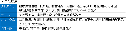 人体の約60%は水分で構成されており、細胞内液や血漿などの体液として存在している。体液はさらに、水に溶けて電気を通すミネラルイオンである電解質(ナトリウム、カリウム、カルシウム、クロールなど)と、水には溶けるが電気は通さない非電解質(ブドウ糖や尿素など)とに区分される。それぞれの電解質はバランスをとりながら、「ナトリウム」はからだの水分調節、「カリウム」は筋肉や神経の制御、「カルシウム」は骨や歯の形成、神経刺激の伝達、血液の凝固、「クロール」は体内への酸素供給など、人間が生命を維持する上で重要な役割を果たしている。血中の電解質濃度に変化が生じた場合、腎機能やホルモンの働きに異常が発生している可能性がある。 電解質検査は、体液中の電解質イオンの濃度を測定し、バランスの崩れを調べて体内の障害を診断するもので、採取した血液や尿を検査装置で検査する。 ![]() 「グルコース検査」