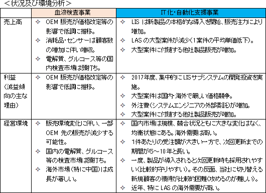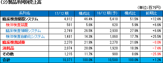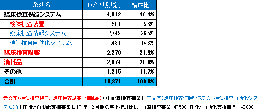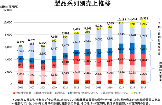 同社の事業は、血液検査のための検体検査装置や臨床検査試薬、消耗品の開発・製造・販売を行う「血液検査事業」と、病院の検査室の人的作業の効率化をIT化・自動化によって支援する「IT化・自動化支援事業」の2事業で構成されており、病院の検査室を総合的にサポートしている。(単一事業であるため、決算短信、有価証券報告書などにはセグメント情報を記載していない。また、同社では決算説明資料等で製品系列別売上高を開示しているが、両事業名としての売上高の開示とはなっていない点には留意する必要がある。) ![]() ![]() ![]() ①血液検査事業