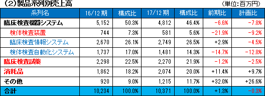 売上高は前期比1.3%増の103億71百万円で過去最高を更新した。臨床検査機器システムが減収だったが、消耗品や他社製品の増加で増収となった。営業利益は同23.8%減の7億73百万円。大型案件に付随する他社製品販売増で粗利率が低下し粗利額も減少したことに加え、研究開発費(臨床検査情報システムのサブシステム開発への投資)の増加などによる販管費増を吸収できなかった。売上はほぼ計画通りで、利益は若干の未達。 ![]() ◎臨床検査機器システム