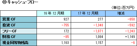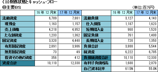 前期比32.0%増収。大型案件の総合提案に付随する他社製品販売が増加した。 ![]() 長短借入金の増加で負債合計は同16億56百万円増加の55億44百万円となった。 利益剰余金の増加で純資産は同5億63百万円増の67億85百万円。 この結果自己資本比率は前期末の61.5%から6.5%低下し、55.0%となった。 ![]() キャッシュポジションはほぼ変わらず。 |