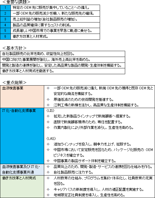 今回販売店契約を締結したRunda Medicalは上海証券取引所上場企業で、約1,700病院という強固な顧客基盤を構築している。前期、当社は直接販売で中国の大型病院にLASの注力製品「CLINILOG V4」を初導入したが、今後はRunda Medicalを相手先としたOEM販売を中心に展開する。効率性・収益性を重視したV4のパッケージ販売で中国の巨大な検体検査自動化ニーズを取り込んでいく。加えて、安定的に事業を拡大させるためにはアフターサービス体制の構築が極めて重要だ。江刺工場でのRunda Medical社員の研修もしっかりと行っていく。また、電解質ユニットに関しても現在はOEM先は1社のみだが、分析装置メーカー中心に新規供給先を開拓中だ。 中国における事業体制としては、現在は駐在員事務所だが段階を見て現法設立による営業本格化、将来的には自社工場の建設など、最適な選択肢を検討していく。 Q:「上場後初めて発表した中期経営計画のポイントはどこでしょうか。」