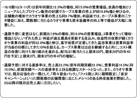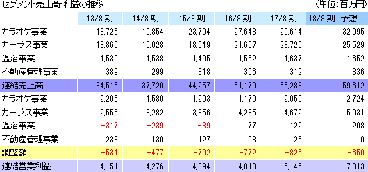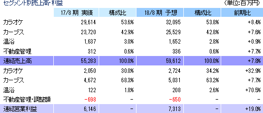 事業は、「まねきねこ」やひとりカラオケ専門店「ワンカラ」を運営するカラオケ事業、“女性専用30分健康体操教室”として中高年齢層をターゲットに女性専用フィットネスクラブ「Curves(カーブス)」を展開するカーブス事業、温浴事業(各種温浴設備を備えた施設の運営)、及び不動産管理事業に分かれる。17/8期の売上構成比は、それぞれ53.6%、42.9%、3.0%、0.6%。連結調整前営業利益の構成比は、それぞれ29.4%、67.0%、1.8%、1.8%。 ![]() ![]() 【成長戦略】