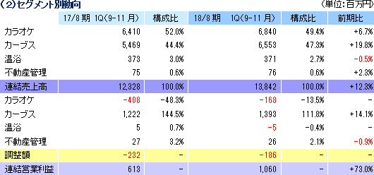 売上高68億40百万円(前年同期比6.7%増)、セグメント損失1億68百万円(前年同期は4億08百万円の損失)。第1四半期末の国内店舗数は前期末と比べて8店舗増の507店舗(前年同期末473店舗)、海外店舗数はシンガポール10店舗(同11店舗)、韓国14店舗(同13店舗)の合計24店舗。国内32店舗(同31店舗)でリニューアルを実施した他、社員独立制度に基づく店舗が31店舗と1店舗増加した。第1四半期は季節要因で営業損失となる事が多い。この第1四半期も営業損失となったが、資本装備率の向上や新規出店が少なかった事(純増:16店舗→8店舗)等で営業損失が減少した。 一部の大手事業者への店舗集約が徐々に進み業界内勢力図が変わりつつある中、競争を勝ち抜くべく、首都圏を中心にした店舗網の充実と独自の企画・サービスの充実に取り組んでいる。具体的には、「ZEROカラ」、「朝うた」、コンテンツホルダーとのコラボ企画等、特定の顧客層や時間帯に照準を当てた基本施策を継続する一方で、「得々宴会パック☆(群馬県/栃木・埼玉一部店舗限定)」、「ファミ割♪(群馬県・栃木県一部店舗にて実施)」等、閑散期の店舗環境に応じたメリハリのある料金施策を実施している。 カーブス事業