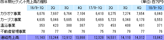 売上高3億71百万円(前年同期比0.5%減)、セグメント損失5百万円(前年同期は5百万円の利益)。東京健康ランドまねきの湯(東京都)、郡山湯処まねきの湯(福島県)、箕郷温泉まねきの湯(群馬県)、大分森温泉まねきの湯、らんぷの湯花園店(共に大分県)の5店舗を運営している。新規出店を行わず、既存の5店舗において、集客施策のブラッシュアップと新コンテンツの導入と共に、一段の設備の省エネ化に取り組んでいる。