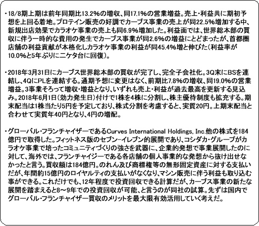 ![]() 利益面では、営業の軌道化と営業時間や人員配置の適正化による店舗運営の効率化で、2014年から集中出店してきた首都圏店舗の利益貢献が本格化してきた。店舗の増加で人件費や地代家賃が増加したものの、減価償却費、広告宣伝費、開店諸費用等が減少した。 ![]() ![]() 10年目を迎え機器入れ替えが増加した前年同期の反動でスポット売上が2億24百万円減少したものの、新プロテインの投入により定期購入の会員契約率が30%から40%に上昇する等でショッピング売上が24億89百万円増と伸び増収をけん引した。 利益面では、第2四半期にカーブス世界総本部の買収に伴う一時的な費用3億28百万円が発生したため、セグメント利益は前年同期比2.6%の増加にとどまった。 尚、3月31日付けで、連結子会社(株)カーブスホールディングス(以下、「CVH」)が特別目的会社(「SPC」)を通して、カーブス事業のグローバル・フランチャイザーであるCurves International,Inc.(以下、「CVI」)、同社の100%親会社Curves International Holdings, Inc. (以下、「CVIH」)、同事業のフィットネスクラブの機器をフランチャイジーに販売するCurves For Women II, L.C.(以下、「CFW」)、及び「CVI」の子会社であるCurves International Japan, LLC(以下、「CVIJ」)、香港子会社、中国子会社の計6社の発行済み全株式を184億円で取得。株式取得後に、「CVI」が、「SPC」、「CVIH」、「CFW」、「CVIJ」を吸収合併した。 ![]() ![]() (3)財政状態及びキャッシュ・フロー(CF)
