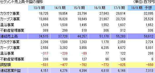 通期予想に対する進捗率は、売上高51.0%、営業利益50.4%、経常利益52.8%、純利益57.5%、と順調。3事業そろって増収・増益となり、いずれも売上・利益が過去最高を更新する見込み。カラオケ事業は売上の増加と収益性の改善が続き、営業利益が前期比32.9%増と伸びる。新規出店は1都3県の駅前繁華街に45店舗(建築25店舗、居抜き20店舗)を計画している。黒字体質が定着してきた温浴事業は既存店のみのため売上は微増だが、営業利益率が当面の目標としてきた10%を超える。カーブス事業は85店舗の新規出店を計画しており、会員数100万人に向け、サービスの充実と店舗網の構築に力を入れる。