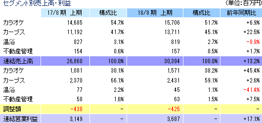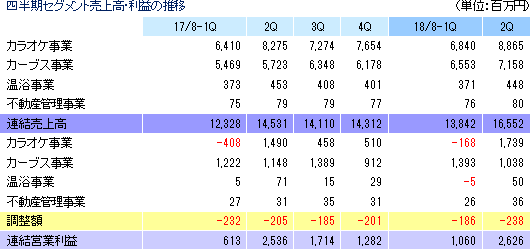 売上高は前年同期比13.2%増の303億94百万円。新プロテインの投入と販売強化によるショッピング売上の増加でカーブス事業の売上が同22.5%増と伸びた他、カラオケ事業の売上も新規出店効果で同6.9%増加した。営業利益は同17.1%増の36億87百万円。カーブス世界総本部の買収に伴う一時的な費用の発生でカーブス事業が同2.6%の増益にとどまったものの、首都圏(1都3県)店舗の好調と店舗効率の改善でカラオケ事業の利益が同45.4%増と伸長。税負担率の低下(38.5%→34.0%)で四半期純利益は23億20百万円と同28.5%増加した。 ![]() ![]() (2)セグメント別動向