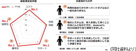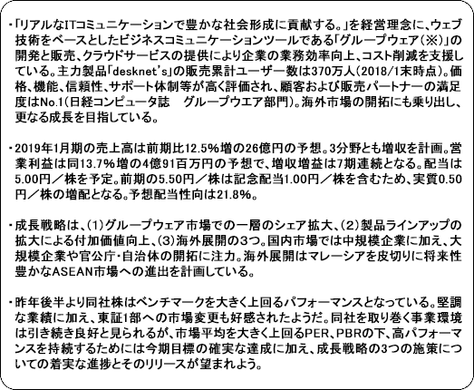 「リアルなITコミュニケーションで豊かな社会形成に貢献する。」を経営理念に、ウェブ技術をベースとしたビジネスコミュニケーションツールである「グループウェア(※)」の開発と販売、クラウドサービスの提供により企業の業務効率向上、コスト削減を支援している。主力製品「desknet's」の販売累計ユーザー数は370万人(2018/1末時点)。価格、機能、信頼性、サポート体制等が高く評価され、顧客および販売パートナーの満足度はNo.1(日経コンピュータ誌 グループウエア部門)。海外市場の開拓にも乗り出し、更なる成長を目指している。