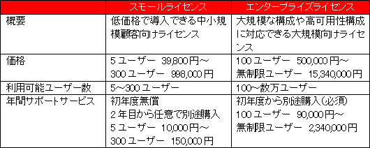 ユーザー数が5~300ユーザーの中規模・小規模ユーザーに対しては「スモールライセンス」を、ユーザー数が300~数万ユーザーの大規模ユーザーに対しては、「エンタープライズライセンス」を販売している。