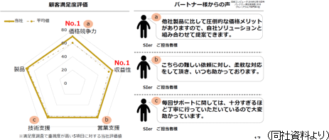 ![]() また、販売パートナーからの評価においても、「価格競争力」、「収益性」、「技術支援」、「担当窓口」、「柔軟さ」、「納期対応」の6項目でトップのスコアとなり、パートナー満足度もNo.1となった。