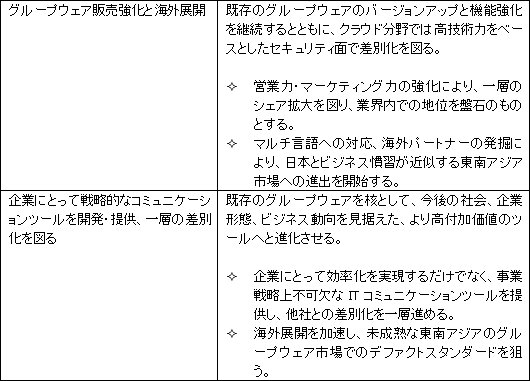 中規模以上の事業所では、今後、国内大手ベンダーは投資効率の観点からグループウェアサービスに力を入れないことが予想され、当社の優位性はますます強まる。