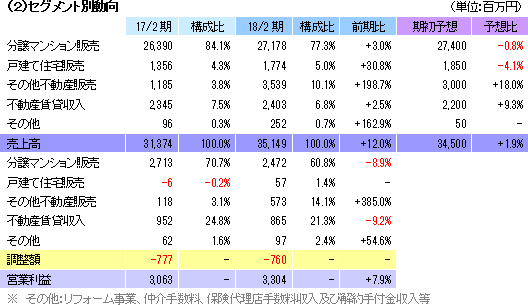 事業セグメントは、「ワコーレ」ブランドで展開する分譲マンション販売、「ワコーレノイエ」ブランドで展開する戸建て住宅販売(販売は両事業共に外部委託)、収益物件や宅地等の開発・販売を手掛けるその他不動産販売、マンション(賃貸マンションブランド「ワコーレヴィータ」他)、店舗、駐車場等の賃貸を行う不動産賃貸収入、及び保険代理店手数料など報告セグメントに含まれない「その他」に区分される。18/2期の売上構成比は、分譲マンション販売77.3%(17/2期84.1%)、戸建て住宅販売5.1%(同4.3%)、その他不動産販売10.1%(同3.8%)、不動産賃貸収入6.8%(同7.5%)、その他0.7%(同0.3%)。セグメント利益の構成比は、分譲マンション販売60.8%(同70.7%)、戸建て住宅販売1.4%(同▲0.2%)、その他不動産販売14.1%(同3.1%)、不動産賃貸収入21.3%(同24.8%)、その他2.4%(同1.6%)。