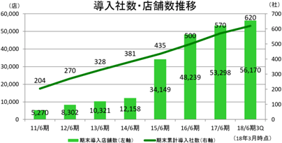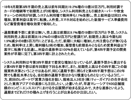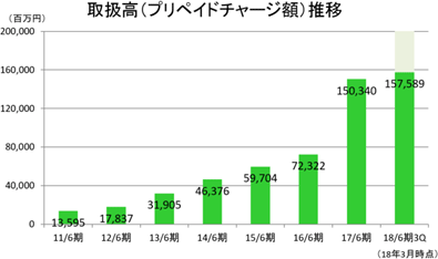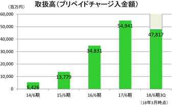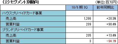 増収増益。プリペイド利用率の高いスーパーマーケット・ドラッグストア業態での利用が堅調だったのに加え、スマートフォンアプリとプリペイドの連携や、上場企業における、株主優待券のプリペイドカード化等の要因により飲食チェーンでも利用が大きく伸長し、取扱高(プリペイド入金額)は前年同期比48.7%増の1,575億円と大幅に伸張。18年3月単月のシステム利用料売上高は過去最高を記録した。 スーパーマーケット業態での成功を受けホームセンターや大手飲食チェーン業態等での新規受注が進んでいる。 ②ブランドプリペイドカード事業
