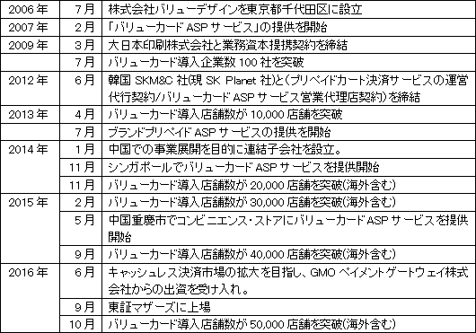 クレジットカード会社で新たな決済手段の開発に取り組んでいた尾上社長は、アメリカでサーバー管理型電子マネーである「ハウスプリペイド」、「ブランドプリペイド」が普及・拡大していることを知り、数年後にはその波が日本にも必ず到来することを予想。いち早く導入に動くが、当該クレジットカード会社では既に非接触IC型電子マネーへの取り組みが中心となっていたため、新たにサーバー管理型電子マネーを手掛けるための人員も予算も不足しており、導入を進めることは難しいのが現実であった。そうした中、尾上社長は、成長が見込まれる「ハウスプリペイドカード」、「ブランドプリペイドカード」を日本で是非とも事業化したいと考えクレジットカード会社を退社し、2006年7月に同社を設立した。 「ハウスプリペイドカード」という文化が無い日本で当初営業活動は苦戦したが、低価格の専用端末を武器に店舗数10店舗程度の小規模事業者を中心に顧客数は着実に増加し、一定のシェアを獲得する。ハウスプリペイドカードマーケットの拡大に伴いシェアは一段と上昇し、顧客規模も中堅、大手へと拡大していった。 2012年からは海外でも事業を展開。2016年9月、東証マザーズに上場した。 ![]() 【1-2 経営理念など】