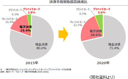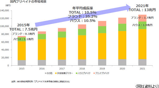 高い安全性、効率性の向上といった発行者、利用者双方のニーズから、「現金決済比率の低下、電子決済のウェート拡大」が続いている。中でもプリペイドカードは今後も更なる伸長が見込まれている。 ![]() 中でもハウスプリペイドカードは2015年度から2021年度までの年平均成長率は10.5%で市場規模は1.9兆円に拡大。ブランドプリペイドカードは同じく年率35.2%成長で1.7兆円へと、市場平均を大きく上回る高成長が見込まれている。(いずれも矢野経済研究所調べ。) ![]() ◎プリペイド決済の種類