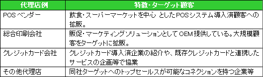 同社ではプリペイドカード事業は先行者利益の大きいビジネスと捉えており、早急なシェア(=導入企業数)獲得が重要と考えている。そのため、同社ではターゲット先の業態や企業に対して業務上深い関連性を持つ企業(POSベンダーやトップセールスが可能な有力企業等)と販売代理店契約を締結し、全国各地を網羅した営業ネットワークを構築している。