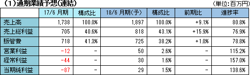 通期業績予想に変更は無い。売上高は前期比9.1%増の18億97百万円と予想。システム利用料売上高は前期比19.2%の10億92百万円と堅調だが、初期売上高は今期も同1.9%減少の8億5百万円にとどまる。ただ、前期に大幅に増加した外注費などが無くなるため、粗利率は上昇し粗利額も2桁の増加。販管費も前期並みとなるため営業利益以下黒字に転換する見通し。 利益の進捗率は100%を超えているが、第4四半期予定の開発案件が早期に完了し第3四半期に計上されたためである。 ![]() |