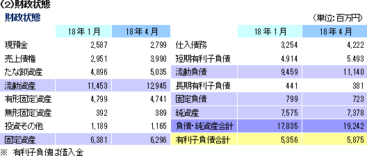 1Q末の総資産は前期末比14億7百万円増の192億42百万円となった。流動資産では、ガーデニングシーズン立ち上がりの売上増加に伴い受取手形及び売掛金が前期末比11億13百万円増35億71百万円となった。固定資産では、減価償却により建物及び構築物が前期末比65百万円減の31億41百万円となった。流動負債では、販売に向けての商品調達が先行して行われることから支払手形及び買掛金が前期末比9億68百万円増の42億22百万円、運転資金を短期借入金へ移行させていることから短期借入金が前期末比6億34百万円増の52億42百万円となった。固定負債では、運転資金を長期借入金から短期借入金へ移行させたため長期借入金が前期末比60百万円減の3億81百万円となった。純資産では、利益剰余金の減少等により前期末比1億97百万円減の73億78百万円となった。