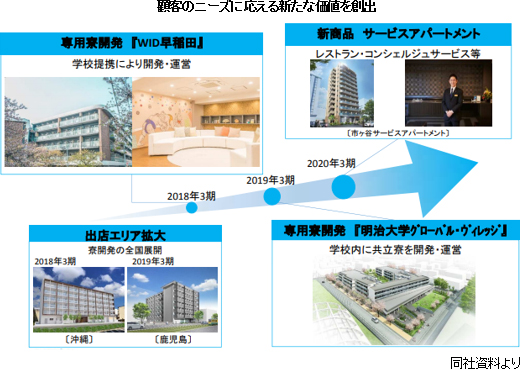 学生寮事業の契約数は、前期比221名減の20,199名、売上高は前期比横ばいの252億72百万円となった。進学率の上昇や海外からの留学生の増加等により高いニーズが継続した。海外留学生の比率は12.7%。新たに6校の大学との提携を実現した。一方で、全国での予備校生数の減少の影響があった。社員寮事業の契約数は、前期比1,066名増の11,899名、売上高は前期比8.2%増の131億円となった。雇用環境の改善が引き続き追い風となったほか、企業による寮制度の導入が増加したことなどにより、大幅に契約数が増加した。ドミール事業の契約数は、前期比72名増の5,293名、売上高は前期比 0.8%増の44億65百万円となった。ワンルームマンションタイプ寮として、提携学校・提携企業からの入居斡旋紹介はもちろんのこと、食事付き寮からの住み替え需要等に対応した。受託寮事業は、売上高は前期比10.2%増の42億14百万円となった。企業・学校が保有している寮を受託請負により管理運営する事業だが、「日本一の下宿屋 としての運営力」により差別化を図って展開している。