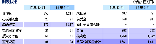 第1四半期末の総資産は前期末と比べて1億34百万円減の14億31百万円。決算を反映して現預金及び純資産が減少した。ただ、前受金は増加しており、提携案件等が順調に進捗している事が推測できる。