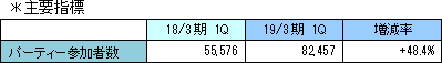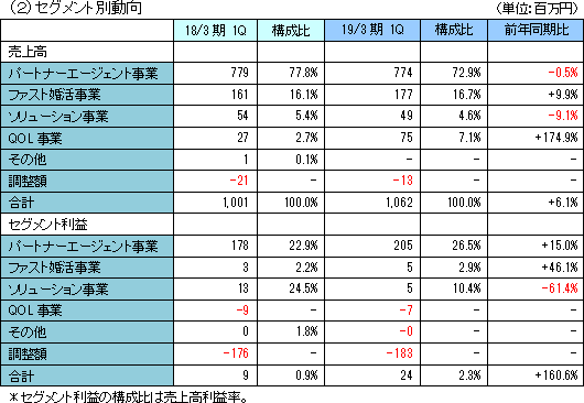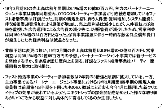 19年3月期第1四半期末の「コネクトシップ」の利用会員数は2万人超。利用事業者数は7社11サービスとなっている。また、一般社団法人結婚・婚活応援プロジェクトと協力・連携し、日本全国の法令を遵守し健全に運営を行っている婚活パーティーの情報を掲載する婚活パーティー情報サイト「Parties」を2018年7月2日にリリースした。 (QOL事業)