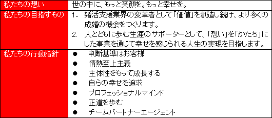 2004年6月、ウェディングの企画および施設の運営を手掛ける株式会社テイクアンドギヴ・ニーズ(4331、東証1部、T&G社)が新規事業として婚活支援事業を始めるにあたり、100%子会社として同社を設立した。そのスタートアップにあたり招聘されたのが大手婚活会社で豊富な経験・実績を積み重ねた現社長の佐藤茂氏。その後T&G社の業況が低調となり、継続的な投資が難しくなったのを機に、2008年5月、佐藤社長を始めとした経営陣と従業員の共同出資により株式を取得し、T&Gグループから独立した。 「顧客成果追求」の結果である成婚率の高さを顧客に評価され、業績は順調に拡大。2015年10月に東証マザーズに上場した。 【1-2 企業理念】