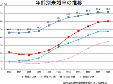 総務省の国勢調査によれば、25-34歳の未婚率は男女とも上昇を続けている。