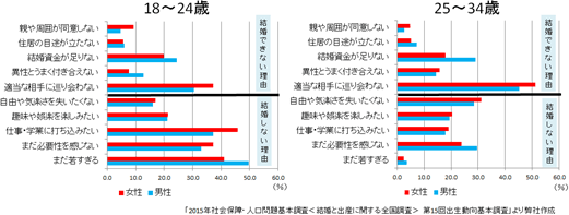 未婚者に独身でいる理由を尋ねたところ、18~24歳の若い年齢層では、「若すぎる」、「必要性を感じない」など積極的な動機が無いことが多く上げられているが、25~34歳では、「適当な相手にまだ巡り会わない」という理由を挙げる割合が増加しており、出会いやその機会に対するニーズが大きいことが窺える。