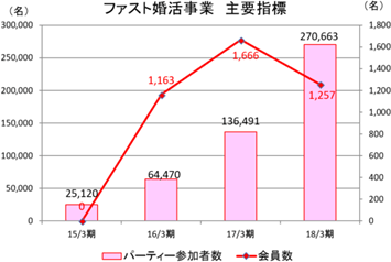 課題であった広告宣伝について2018年1月にクリエイティブ変更を行うなど改善・強化してきたが、主要指標は前期実績を下回った。ただし、2018年1月のドロンジョ、ブラック・ジャックの両アニメキャラクターを用いた新クリエイティブについては好評を博し、Webサイトへの来訪数も増えており、入会に繋げるべく様々な施策を打つ考えだ。 7月月初在籍会員数は、前期末の在籍会員数11,700名よりも減少しているが、これは特別コースの終了期限の到来による退会が生じたことによるもので、収益に及ぼす影響は軽微である。 今期は新規出店を計画せず、既存店舗の成長に注力する。 ![]() (ファスト婚活事業)