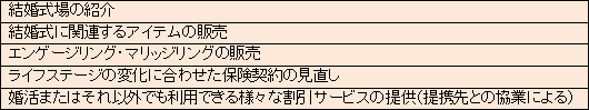 成婚会員向けサービスを引き続き充実させ、株式会社リクルートゼクシィなびと提携した全国の成婚会員向けの「式場紹介サービス」、「自社ブランドのブライダルリング販売」、「ライフステージの変化に応じた保険契約の見直しサービス」など、提携によるアイテム数の拡充と提供エリアの拡大による利用者増を図る。加えて、結婚に関する価値観の多様化から、披露宴を行わずに近親者や友人とパーティーのみ行う、いわゆる「ナシ婚」の需要が拡大しており、新規事業として、近い友人とのお披露目パーティー等が開催できる会場の運営、パーティーやイベント開催を受託するサービスを検討している。 新たに保育士向けの婚活支援サービスを開始する予定である。 |