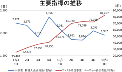 ◎CONNECT-ship(コネクトシップ)2018年4月から課金を開始した。 パートナーエージェントと他社間でコンタクト(お見合い)が成立した場合はコンタクト成立料を相手方となる他社から、他社(A社とB社)間のコンタクト成立については両社からコンタクト成立料を受領する。 現在、パートナーエージェントによる月間のコンタクト成立件数は約29,000件まで増加している。 「日本で一番お見合いが組めるオープンなプラットフォーム」を目指し、引き続き利用事業者及び利用者の増加に努め、また利用事業者との連携を強化してコンタクト成立件数の増加、顧客成果の最大化に努める。 ◎地方自治体向け婚活支援ソリューション 婚活マッチングシステム「parms」の提案、導入、支援に注力する。 2018年6月には新たに埼玉県への「parms」提供が始まった。 埼玉県は出生率が全国平均よりも低く、未婚率は男女ともに年々上昇しており、この状況を改善するために、埼玉県は「SAITAMA 出会いサポートセンター」を開設し、少子化に歯止めをかけたいと考えている。 同社は「parms」の提供に加え、同センターの運営サポートも行う。 また、新たに地方自治体向けに婚活パーティー情報掲載サービスの開始を検討している。 ④QOL事業