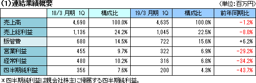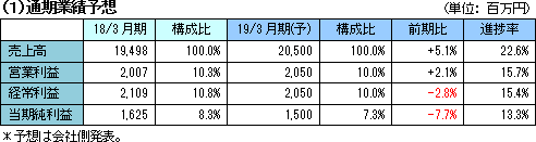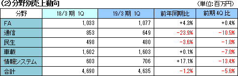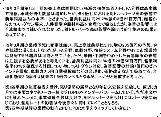 売上高は前期比5.1%増の205億円の予想。やや低調な滑り出しとなったが、FA分野、車載分野、情報システム分野中心に市場環境は良好で5%増収は可能と見ている。ただ、米国・中国を中心とした貿易摩擦の影響は注視する必要があると考えている。