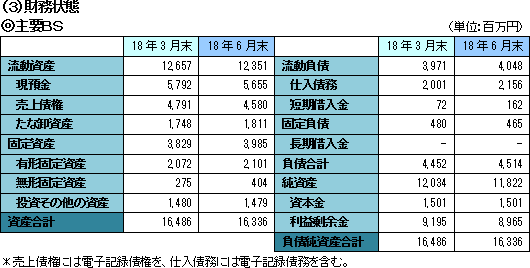 仕入債務増などで負債合計は同62百万円増加の45億14百万円。利益剰余金の減少で純資産合計は同2億12百万円減少の118億22百万円。