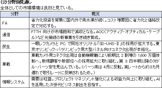世界的にIoT、4Kや8Kの高画質化ニーズが高まる中、通信分野(海外における光通信化)、FA分野(グローバルな生産性向上ニーズ)、業務分野(セキュリティニーズ)において、堅牢性や長期信頼性といったノウハウの展開や高速POFによる市場創出により、通信分野やFA分野で規模と収益性を堅持する。