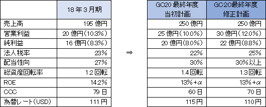 今期初、GC20の最終年度である2021年3月期の計画を以下のように修正した。売上高は据え置くものの、利益、利益率を引き上げた。