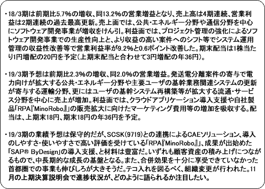 売上高は前期比2.3%増の168億円。発送電分離案件の寄与で電力向けが拡大する公共・エネルギー分野や主要ユーザの基幹業務関連システムの更新が寄与する運輸分野、更にはユーザの基幹システム再構築等が拡大する流通・サービス分野を中心に売上が増加する。営業利益は同2.0%増の15億45百万円。クラウドアプリケーション導入支援や自社製品「RPA『MinoRobo』」の販売拡大に向けたマーケティング費用等の増加に加え、新卒(56名が4月に入社)を中心にした人員増による販管費の増加等を織り込んだ。 配当は、1株当たり上期末18円、期末18円の年36円を予定(予想配当性向30.1%)。 (2)セグメント別取り組み