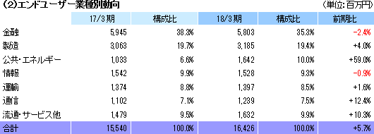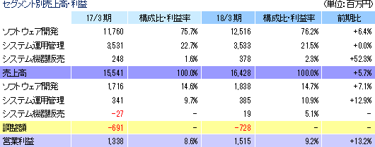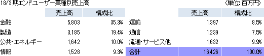 事業は、ITコンサルを含めた、システムやソフトウェアの開発、更改等のソフトウェア開発事業、開発したシステムの運用や保守・管理、或いはヘルプデスク等を手掛けるシステム運用管理事業、及びシステム開発に付随する機器販売を行うシステム機器販売事業の3事業に分かれ、それぞれ76.2%、21.5%、2.3%(18/3期実績。以下同じ)。ソフトウェア開発事業は、システム全体の開発を一括して請け負う業務と顧客の社内に常駐してシステムの一部の開発を請け負う業務(顧客によっては100人規模で常駐する)に分かれ、銀行向けはセキュリティの面から大半が常駐型で、その他の業種向けは一括請負型が多い。同社がストックビジネスと位置付けている常駐型は安定しているが(短期的な案件の波はある)、人月単価での受け取りとなり人材派遣に近い収益モデルであり、一括請負型は高い収益性を追求できるが、受注に波があり、開発リスクを伴う。 システム運用管理事業では、システムの運用管理(顧客のデータセンターに常駐してのエンドユーザーのシステムの運用管理、エンドユーザーの施設に常駐しての運用管理、ネットワークを介しての運用管理)、コールセンター(ヘルプデスク)の運用等を手掛ける。 システム機器販売事業は、開発に付随して機器を納入するケースが減っている事に加え、クラウドへの移行もあり、減収傾向が続いているが、元来、単純な機器販売の利益貢献は少なく、利益面での影響は軽微である。 エンドユーザー業種別売上高