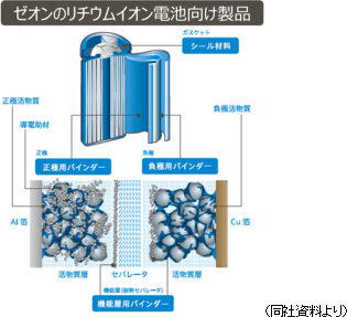 リチウムイオン電池用材料として負極及び正極、機能層(耐熱セパレータ―)用バインダー、シール剤を供給している。