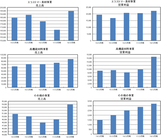 生産した素材そのものを顧客に販売する素材型ビジネスが中心の「エラストマー素材事業」、素材を同社において一次加工し顧客に販売する部材型ビジネスが中心の「高機能材料事業」、「その他の事業」がある。