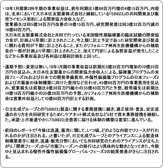 北米における「SB623」の脳梗塞用途の開発、製造、販売についてはパートナー製薬会社として、大日本住友製薬株式会社と契約を締結している。
